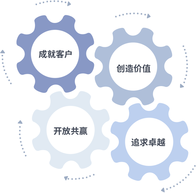 成就客户是一切决策的出发点,创造价值是衡量所有工作的标准,追求卓越是J9集团国际站做事做人的态度,开放共赢是J9集团国际站的格局也是最终的结果。价值观的齿轮环环相扣,推动着组织里的每个人不断向前。